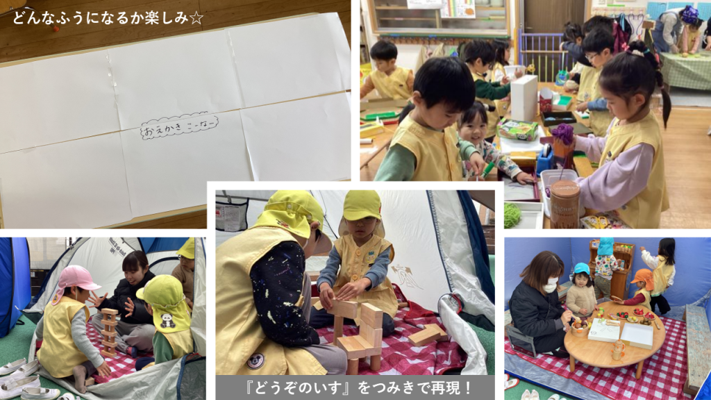 テントの中には、つみきコーナーがあり、生活発表会の劇『どうぞのいす』を再現しながら遊ぶ子ども達の姿がありました。