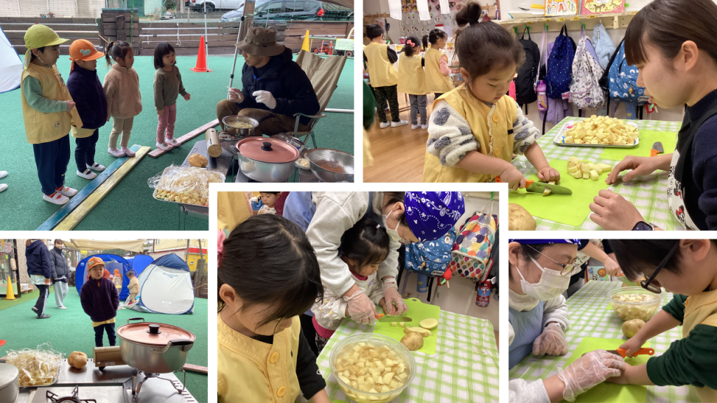 先日の大根パーティーでいただいたジャガイモを園内で調理し、園庭でキャンプ気分を味わいながら粉ふき芋にしました。「いい匂い!」と完成を待ちきれず、子どもたちは何度も確認しに来ていました。