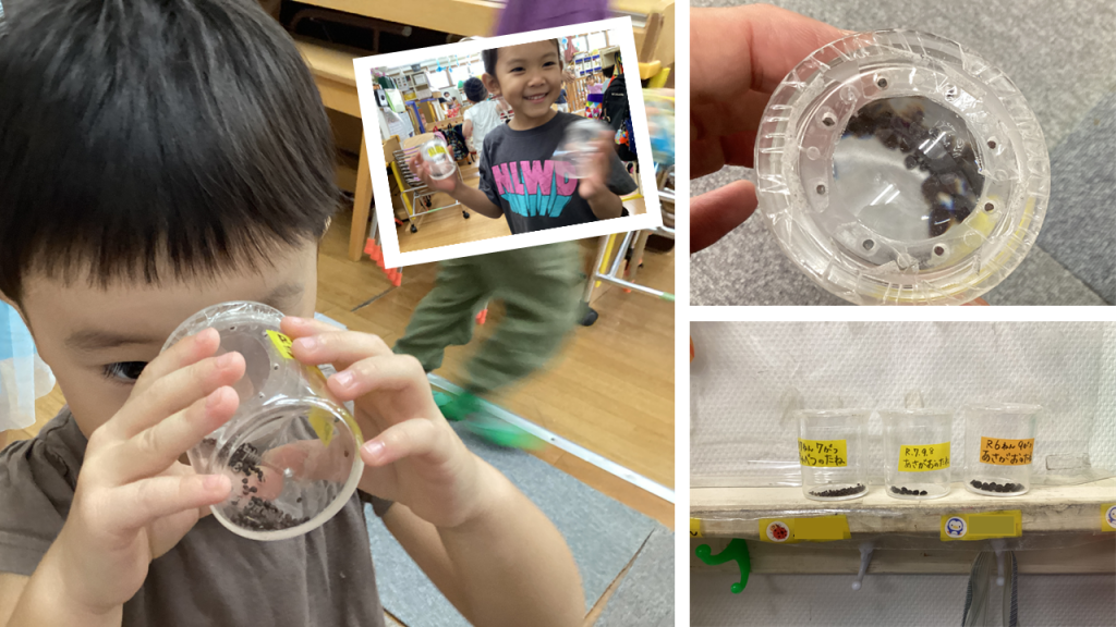 ファームコスモスで採取したいろいろな種類のタネがケースに入れて、いつでも子どもたちが見れるように置いてあります。