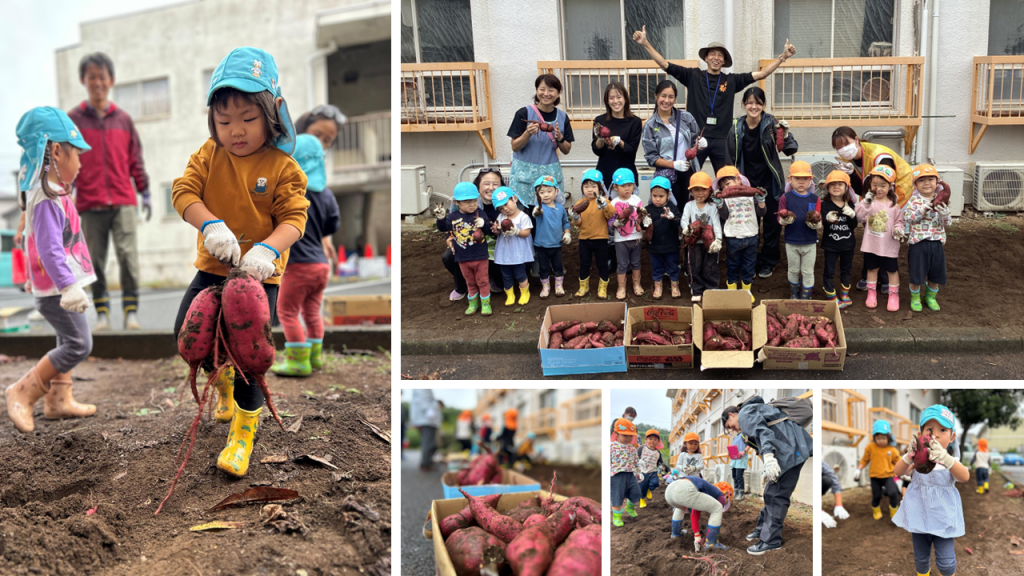 『ズボッ』と抜けた瞬間には「おおぉ!」と歓声が上がります。顔よりも大きなさつまいもを両手で抱える姿には達成感があふれていました。