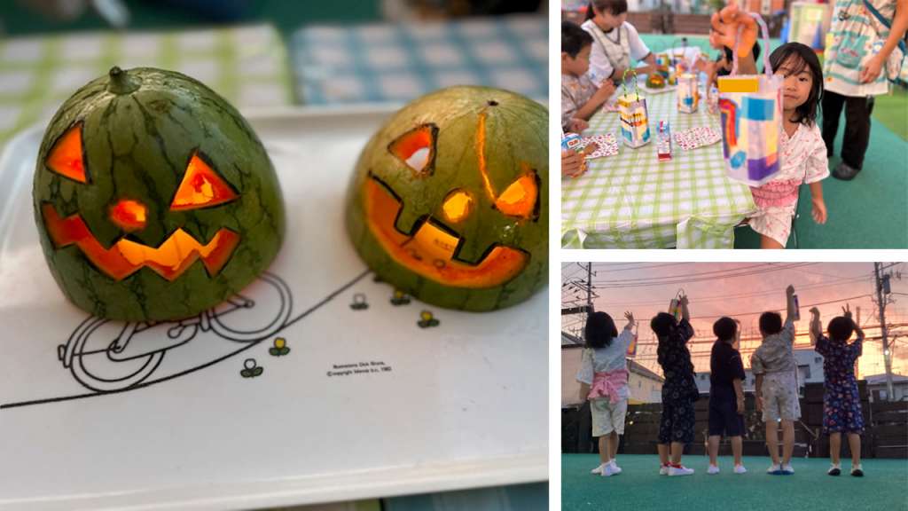 ファームコスモスで実ったスイカを子どもたちと一緒に中身をくりぬき、ハロウィン風にランタンも雰囲気を盛り上げてくれます。「わぁ!」と光るランタンを見ながら目を輝かせ非日常の体験を思いきり楽しんでいました。