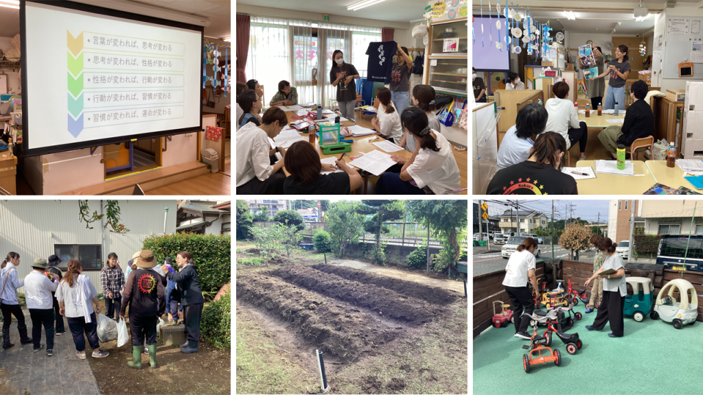 午前中は日ごろお世話になっている畑の草むしりを行い、自然の中で気持ちもリフレッシュ。『コスモスワークショップ』では動画を通して学びを共有し、参加型研修『ほいくのものさし』では園の環境づくりについて話し合いました。また、園全体の安全点検を実施し、安心できる環境を全員で再確認。最後は、今年度から仲間に加わった先生が制作したNEW園Tシャツのお披露目があり、笑顔あふれる温かな空間が広がりました。